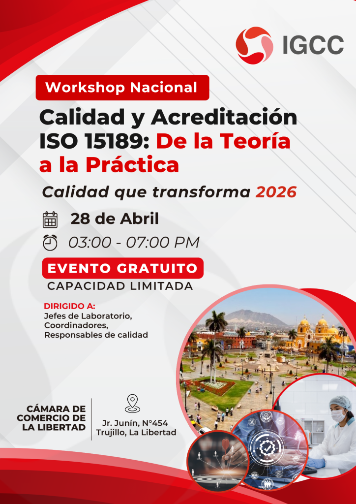 Bajo esta premisa, IGCC presenta el Workshop Nacional: ISO 15189 en Acción – De la teoría a la práctica, una iniciativa que inicia en la ciudad de Trujillo y que forma parte de una proyección más amplia orientada a llevar conocimiento aplicado a distintas regiones del país.